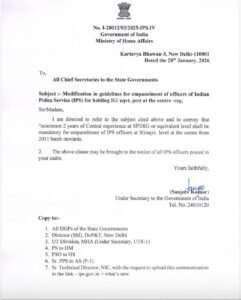 IG बनने से पहले केंद्रीय प्रतिनियुक्ति अब अनिवार्य नई दिल्ली।भारत सरकार ने भारतीय पुलिस सेवा (IPS) अधिकारियों के एम्पैनलमेंट नियमों...