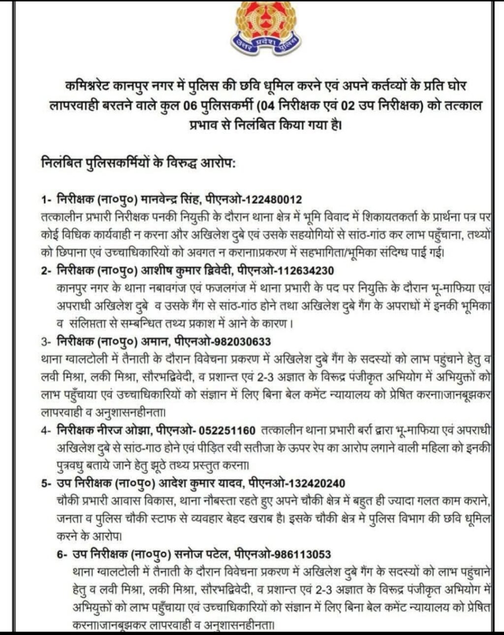 - निरीक्षक मानवेन्द्र सिंह – पनकी थाने में तैनाती के दौरान भूमि विवाद के मामले में शिकायतकर्ता के प्रार्थना पत्र पर कोई कार्रवाई नहीं की। आरोप है कि उन्होंने अखिलेश दुबे और उसके साथियों को लाभ पहुँचाया।