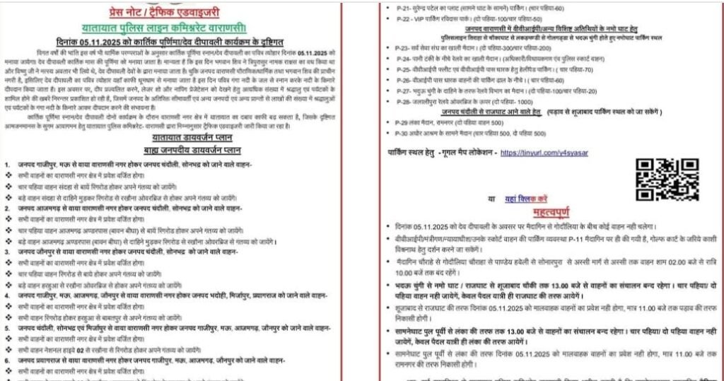 देव दीपावली और कार्तिक पूर्णिमा के अवसर पर 05 नवम्बर 2025 को वाराणसी में होने वाले विशाल धार्मिक आयोजनों को देखते हुए यातायात पुलिस कमिश्नरेट वाराणसी ने विस्तृत ट्रैफिक एडवाइजरी जारी की है।