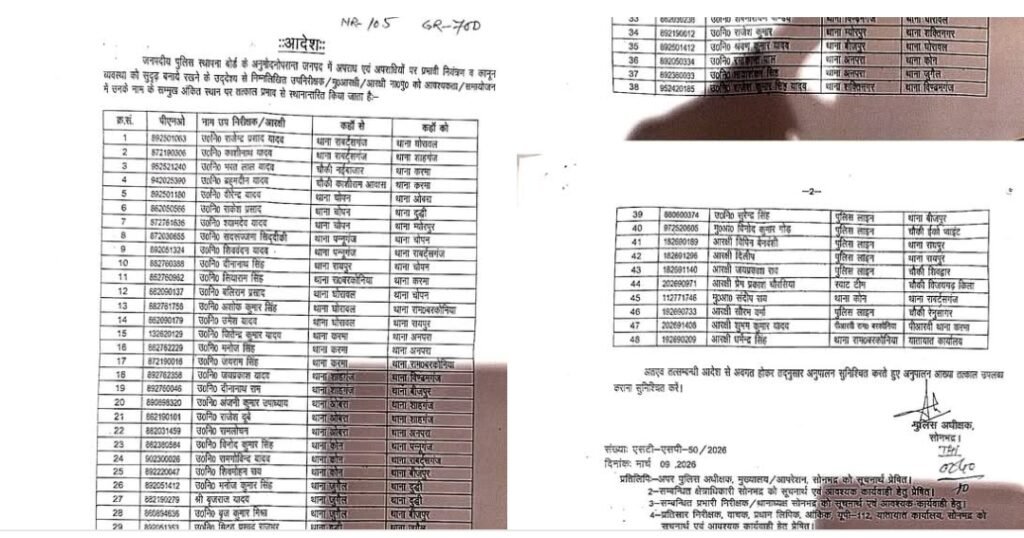 जिले में अपराध नियंत्रण और कानून व्यवस्था को और अधिक मजबूत बनाने के उद्देश्य से पुलिस विभाग में बड़ा प्रशासनिक फेरबदल किया गया है। जनपदीय पुलिस स्थापना बोर्ड की संस्तुति के बाद पुलिस अधीक्षक सोनभद्र ने 48 उपनिरीक्षकों, मुख्य आरक्षियों और आरक्षियों के तबादले के आदेश जारी किए हैं।